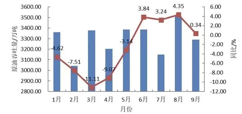 9月原油生产增速加快,原油加工较快增长,原油进口同比增长。根据国家统计局的数据,9月规上工业原油产量1777万吨,同比增长4.1%;1—9月规上工业原油产量16263万吨,同比增长1.7%;9月,规上工业加工原油6269万吨,同比增长6.8%;1—9月规上工业原油加工量55081万吨,同比增长3.7%。根据海关总署统计数据,9月原油进口量为4725.2万吨,同比增长3.9%;1—9月原油累计进口量为4.23亿吨,同比增长2.6%。