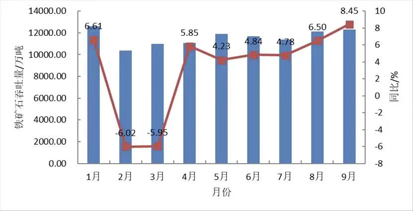 9月铁矿石进口同比增长。根据海关总署的统计数据,9月我国进口铁矿石11632.6万吨,同比增长11.72%。1—9月,我国铁矿石及其精矿进口量91768.5万吨,同比下降0.1%。