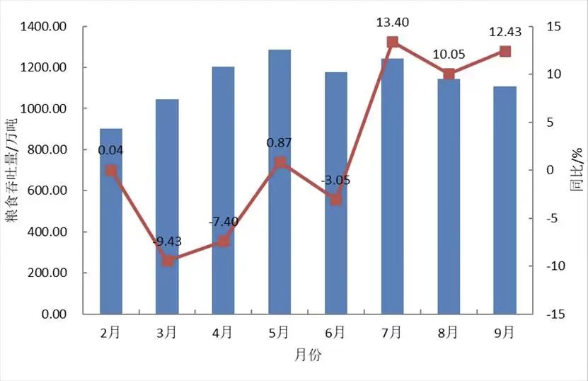 9月,中国港口协会统计的主要沿海内河港口企业累计完成粮食吞吐量1520.20万吨,同比增长17.9%,其中累计完成外贸粮食吞吐量831.85万吨,同比增长31.3%。2025年1—9月,主要港口企业累计完成粮食吞吐量14291.21万吨,同比增长3.8%,其中累计完成外贸粮食吞吐量6940.09万吨,同比下降11.3%。9月,大连港集团、营口港务集团、天津港集团、烟台港集团、青岛港集团、日照港集团、连云港港口控股集团、宁波舟山港股份、广州港集团、北部湾港股份等主要粮食接卸港口企业累计完成粮食吞吐量1108.01万吨,同比增长12.43%。2025年1—9月,上述主要粮食接卸港口企业累计完成粮食吞吐量10194.57万吨,同比下降0.91%。2025年主要粮食接卸港口企业月度粮食吞吐量及同比增速见图5。