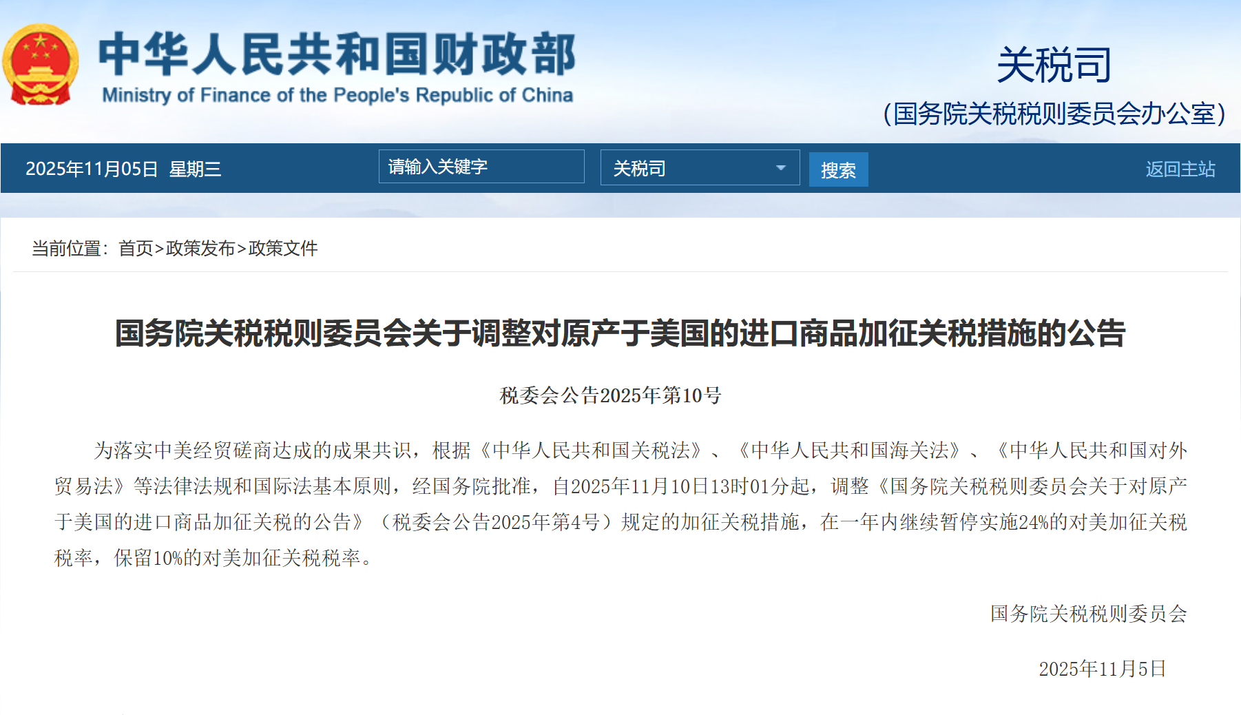同日,国务院关税税则委员会发布《关于调整对原产于美国的进口商品加征关税措施的公告》。为落实中美经贸磋商达成的成果共识,根据《中华人民共和国关税法》、《中华人民共和国海关法》、《中华人民共和国对外贸易法》等法律法规和国际法基本原则,经国务院批准,自2025年11月10日13时01分起,调整《国务院关税税则委员会关于对原产于美国的进口商品加征关税的公告》(税委会公告2025年第4号)规定的加征关税措施,在一年内继续暂停实施24%的对美加征关税税率,保留10%的对美加征关税税率。