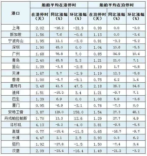 船舶在港时间是指船舶抵达港口待泊锚地到靠泊完成装卸作业离开泊位之间的总时长。该指标集中体现了港口设施设备、引航、调度、装卸、集疏运、口岸通关等综合效率。船舶在泊时间是指船舶抵靠泊位进行装卸作业到完成作业离开泊位的总时长。该指标主要反映了港口在泊期间的装卸作业效率。