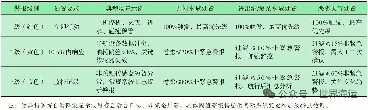 针对警报过载会削弱船员情境意识的问题,笔者利用系统既有分级功能,推行了基于航行阶段的警报分级处置策略,如表2所示。实践表明,该动态分级管理策略有效降低了警报总体频次,使驾驶员得以将更多注意力集中于高优先级警报 ( 如碰撞风险 ) 和重要航行决策。