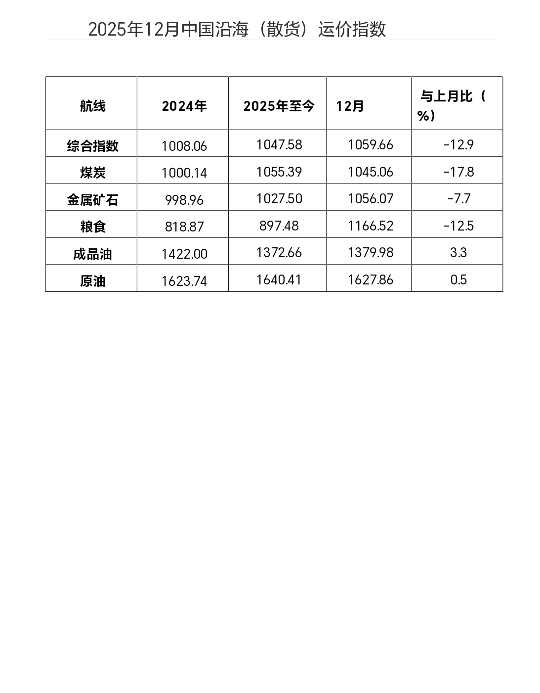 2025年12月中国沿海(散货)运价指数