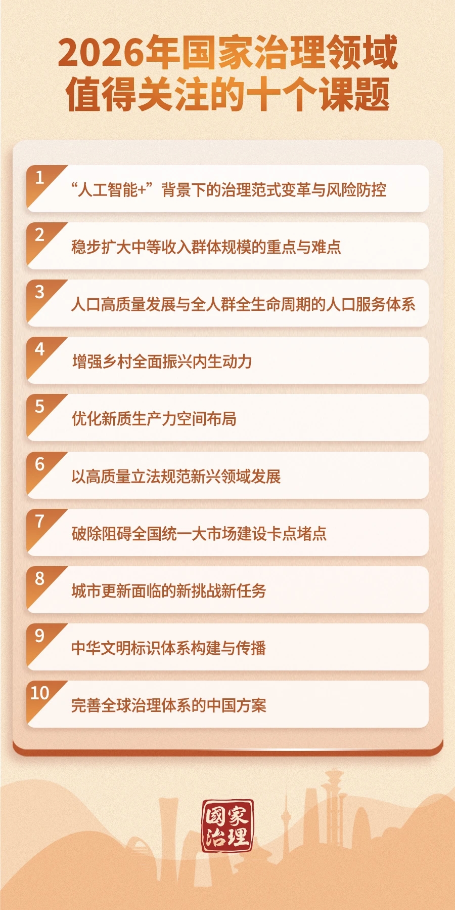 2026年是“十五五”开局之年,在新年贺词中,习近平总书记提出殷殷嘱托:“我们要锚定目标任务,坚定信心、乘势而上,扎实推动高质量发展,进一步全面深化改革开放,推进全体人民共同富裕,续写中国奇迹新篇章。”贯彻落实习近平总书记的殷殷嘱托,2026年国家治理领域有哪些重大课题值得我们关注?
