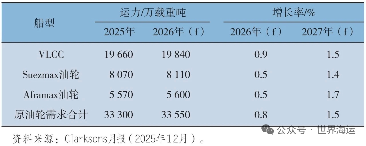Clarksons最新预测:2026年原油轮运力总需求约为33 550万载重吨、同比增长0.8%,运力总供给约为45 180万载重吨、同比增长2.9%,需求增速小于供给增速,将给运输市场带来一定的压力;运力依然过剩,运力总供给大于总需求约11 630万载重吨,其中VLCC、Suezmax、Aframax油轮运力供给过剩分别为7 720、2 240、1 670万载重吨。原油轮各船型运力供需表现预测分别见表2、表3。
